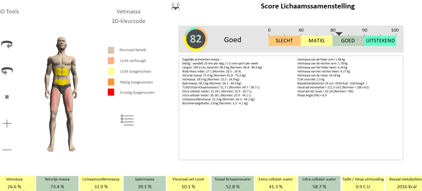 De biomassa (lichaamssamenstelling) meting, geeft een uitgebreid inzicht in de verhoudingen tussen verschillende componenten van het lichaam en hun invloed op jouw algehele gezondheid. In tegenstelling tot enkel het meten van gewicht of het berekenen van de Body Mass Index (BMI), biedt een analyse van de gehele lichaamssamenstelling een veel gedetailleerder beeld van de gezondheidstoestand. Door inzicht te krijgen in de samenstelling van het lichaam, zoals de verdeling tussen vet- en spiermassa, intra- en extracellulair water, botmineralen en de hoeveelheid metabolisch actieve lichaamscellen, kunnen specifieke gezondheidsrisico's veel nauwkeuriger worden geïdentificeerd. Zo kan bijvoorbeeld een te hoge viscerale vetmassa – vet dat zich rond de organen ophoopt – een verhoogd risico op hart- en vaatziekten of diabetes type 2 aangeven. Daarentegen kan een hoge spiermassa bijdragen aan een gezond metabolisme en betere fysieke prestaties.