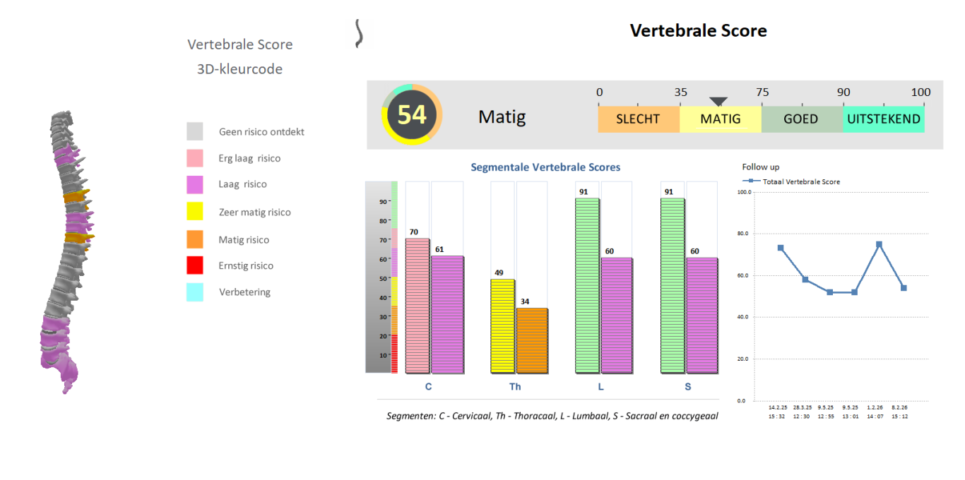 Tijdens de metingen wordt uitgebreid gekeken naar de gezondheid van de wervelkolom. Dit omvat onder meer het analyseren van de druk per afzonderlijke wervel en het identificeren van eventuele overbelasting per segment – van de cervicale wervels (nek) tot aan de thoracale (middenrug), lumbale (onderrug), sacrale (heiligbeen) en coccygeale wervels (staartbeen). Door deze gedetailleerde benadering kunnen we een nauwkeurig beeld krijgen van de conditie van de wervelkolom en eventuele knelpunten vroegtijdig opsporen. Dit stelt je in staat om passende interventies toe te passen, zodat je met meer bewegingsvrijheid en minder klachten kunt blijven bewegen.