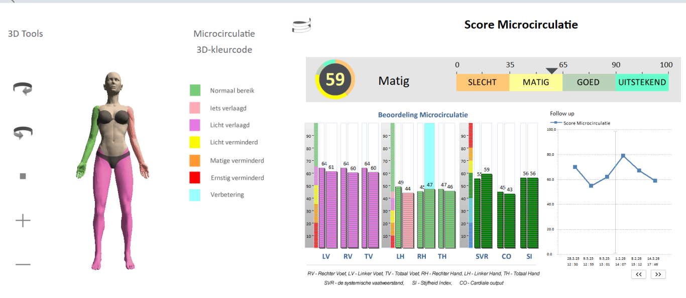 Met microcirculatie wordt de mate van weefseldoorbloeding door de allerkleinste capillaire ‘haarvaatjes’ bedoeld. Dit zijn belangrijke gegevens om te kunnen beoordelen of de weefsels voldoende voorzien worden van o.a. voedingstoffen en zuurstof en of er voldoende afvoer van allerlei metabolische afvalstoffen (bv lactaat) plaatsvindt. Microcirculatie speelt een sleutelrol bij het herstel van weefsel en het genezingsproces van wonden. Aandoeningen zoals diabetes, arteriosclerose en hypertensie kunnen de microcirculatie negatief beïnvloeden. Een goede evaluatie van de microcirculatie kan helpen om vroegtijdig problemen te identificeren en tijdig interventies te treffen om weefselbeschadiging en systemische complicaties te voorkomen. Deze bepalingen worden voor ieder ledemaat afzonderlijk bepaald, zodat eventuele problematiek gedetailleerd in kaart kan worden gebracht. De bloedstroom in de ledematen is een belangrijke indicator van de microcirculatie in het hele lichaam, inclusief de romp. Dit komt doordat de ledematen verder van het hart verwijderd zijn en daardoor gevoeliger kunnen zijn voor veranderingen in de doorbloeding. Wanneer er problemen ontstaan in de bloedcirculatie, zoals vernauwde bloedvaten of verminderde doorstroming, worden deze vaak als eerste zichtbaar in de ledematen. Denk hierbij aan koude handen en voeten, tintelingen of verminderde wondgenezing.
